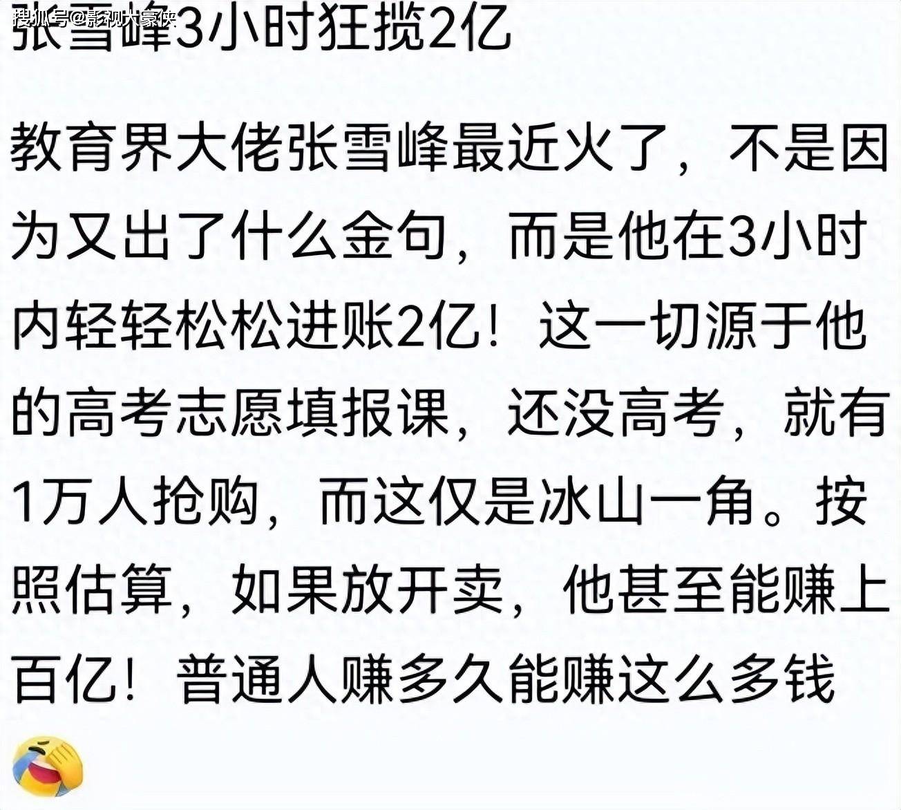 有网民发了一个消息,张雪峰在还没有高考之前,就在3个小时内狂揽了3个亿!这收入来源于他的高考志愿填报课,而现在已经开始高考了,那岂不是赚的更多?