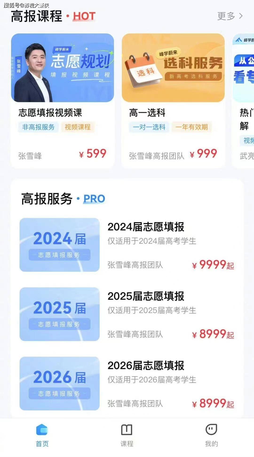 现在张雪峰的高考课程已经出到了2026年的,2024年志愿填报9999元起价,还有高一选科的课卖,真的是从高中起,张雪峰就包揽了所有!每一个上了高中的孩子,都成了张雪峰的生意对象。