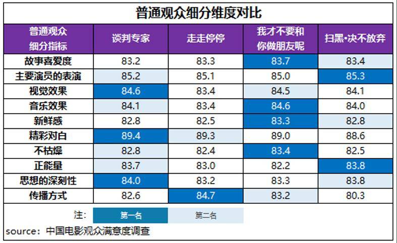 综合不同观众的细分维度评价来看,普通观众各细分维度的高分评价较为分散,专业观众评价则相对集中。在普通观众评价体系中,《谈判专家》的视觉效果、精彩对白、思想的深刻性,《走走停停》的传播方式,《我才不要和你做朋友呢》的故事喜爱度、音乐效果、新鲜感和不枯燥指标,以及《扫黑·决不放弃》的主要演员的表演、正能量得分居第一位。