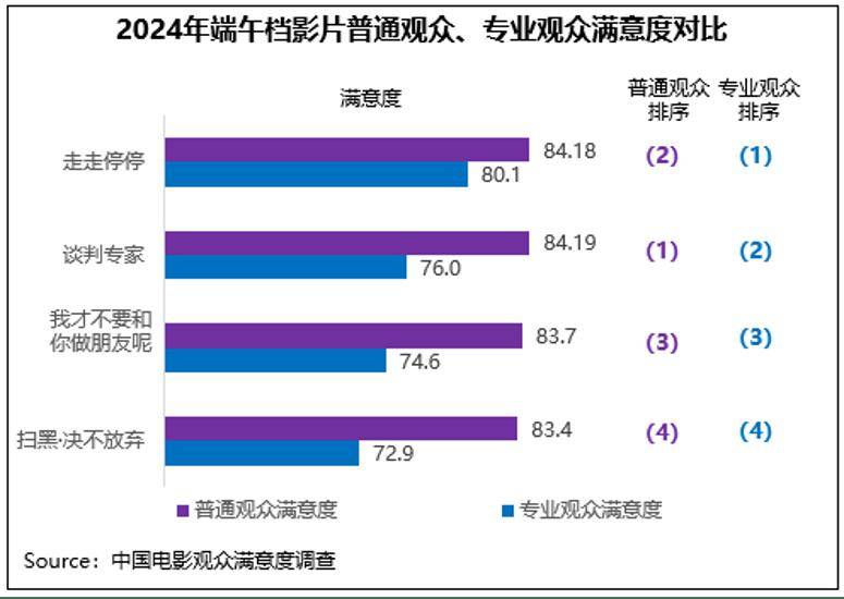 中国电影观众满意度调查结果显示,2024年端午档四部主调查影片满意度均超82分,《走走停停》《谈判专家》分别以83.9分、83.7分居前两位。端午档延续了此前“五一”档电影数量充足、类型丰富多元的供给特征,影片满意度表现也相对均衡,较好地满足了不同观众的观影需求。